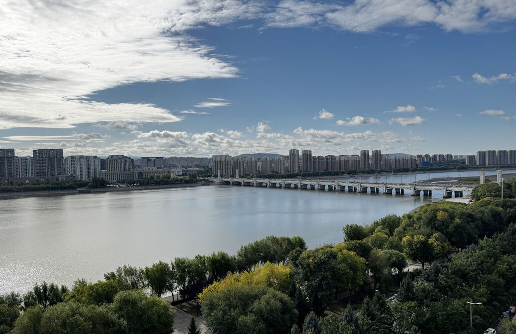 近日,秋季的牡丹江江宽水阔,岸边树叶褪去翠绿,换上斑斓衣装,江水倒映着两岸的美景,天高云淡,壮美如画。