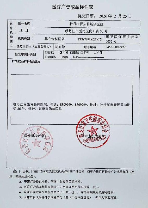 牡丹江胃康胃肠病医院-医疗广告审查材料(影视、广播、户外、网络)