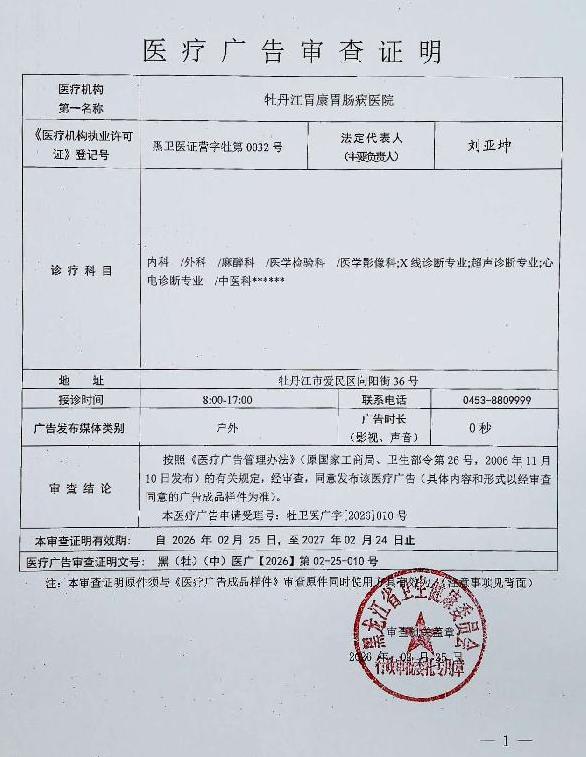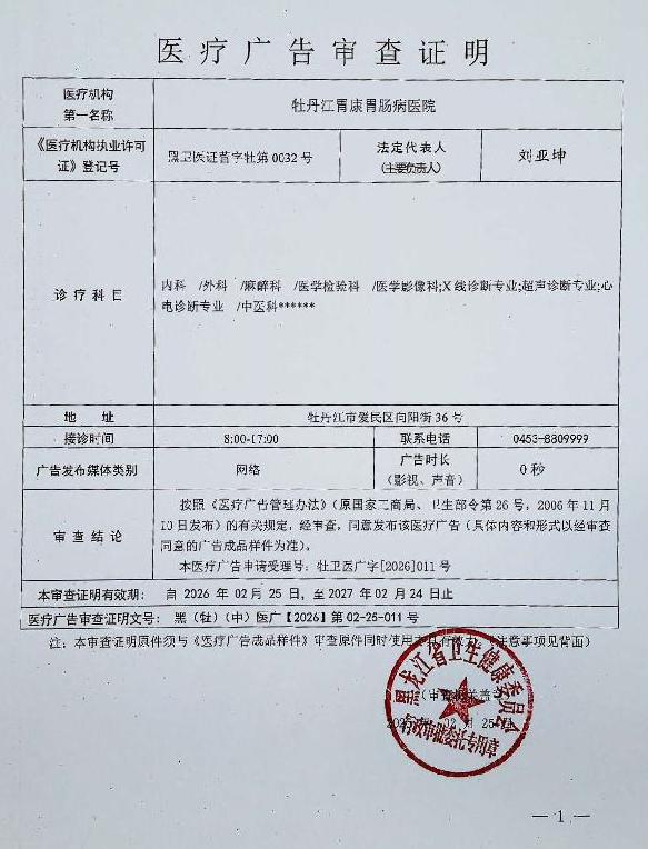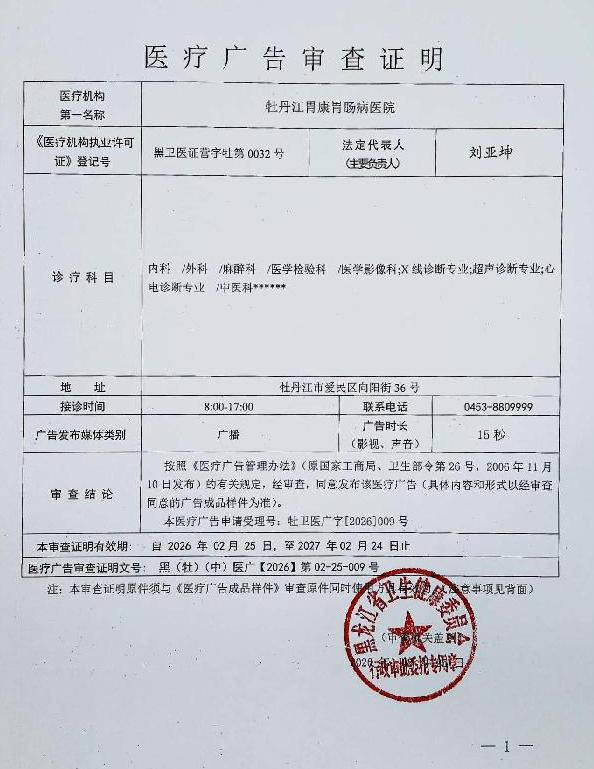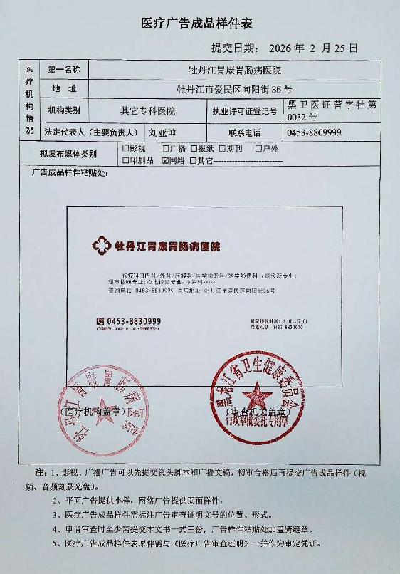 • 牡丹江胃康胃肠病医院-医疗广告审查材料(影视、广播、户外、网络)