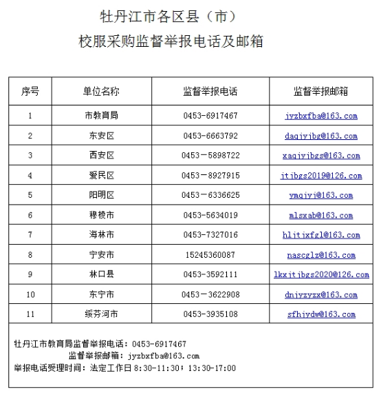 牡丹江市各区县(市)校服采购监督举报电话及邮箱
