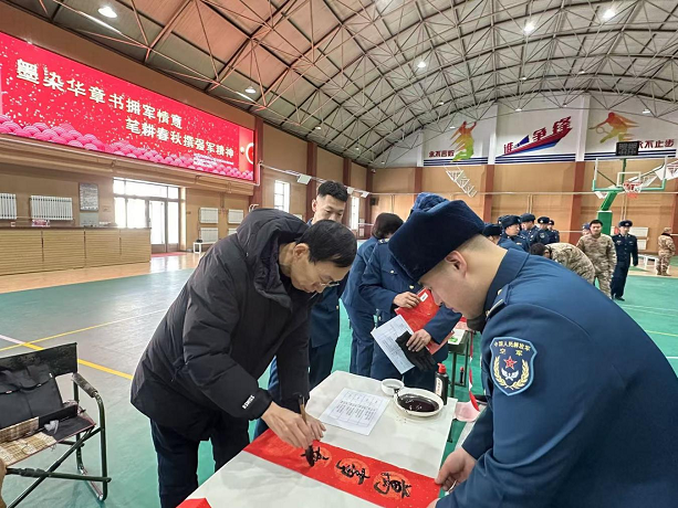 活动最后,牡丹江“橄榄绿”双拥文化服务队志愿者、甲骨文书法研究会的老师们拿起毛笔现场挥毫,饱蘸浓情,把对部队官兵的关爱倾注于笔端,以饱满的热情、精湛的技艺书写了一幅幅妙趣横生、富有军旅特色的迎春对联,整个营区充满了节日祥和喜悦的氛围。