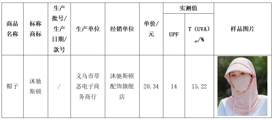 防紫外线性能是防晒面罩的核心功能。防晒产品同时满足UPF(紫外线防护系数)>40且T(UVA)AV(纺织品对长波紫外线防护能力的指标,数值越低,防护效果越好)<5%时,方可被认定为具有防紫外线性能。本次比较试验中,20款样品的UPF实测值最高的达到1413,而一款标称为“沐驰斯顿”的防晒帽样品实测值仅为14,被判定为不具备防紫外线功能。
