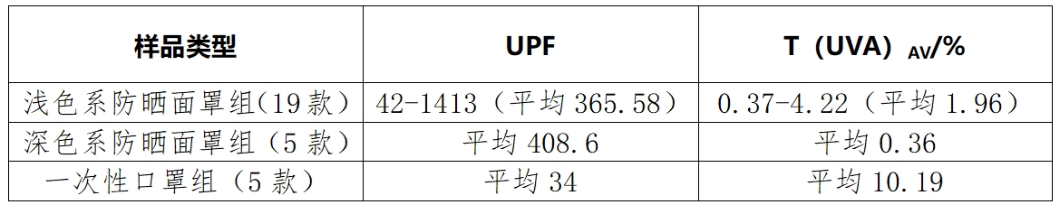 比较试验结果显示,19款浅色系防晒面罩组(去掉1款不具备防紫外线性能的样品)UPF值在42—1413之间,平均为365.58,T(UVA)AV值在0.37%—4.22%之间,平均值为1.96%;5款深色系防晒面罩组UPF平均值408.6,T(UVA)AV平均值为0.36%,深色系防晒面罩防紫外线性能优于浅色系防晒面罩;一次性口罩产品防紫外线性能远低于专业防晒面罩,5款一次性口罩组UPF平均值仅为34,T(UVA)AV平均值达10.19%。