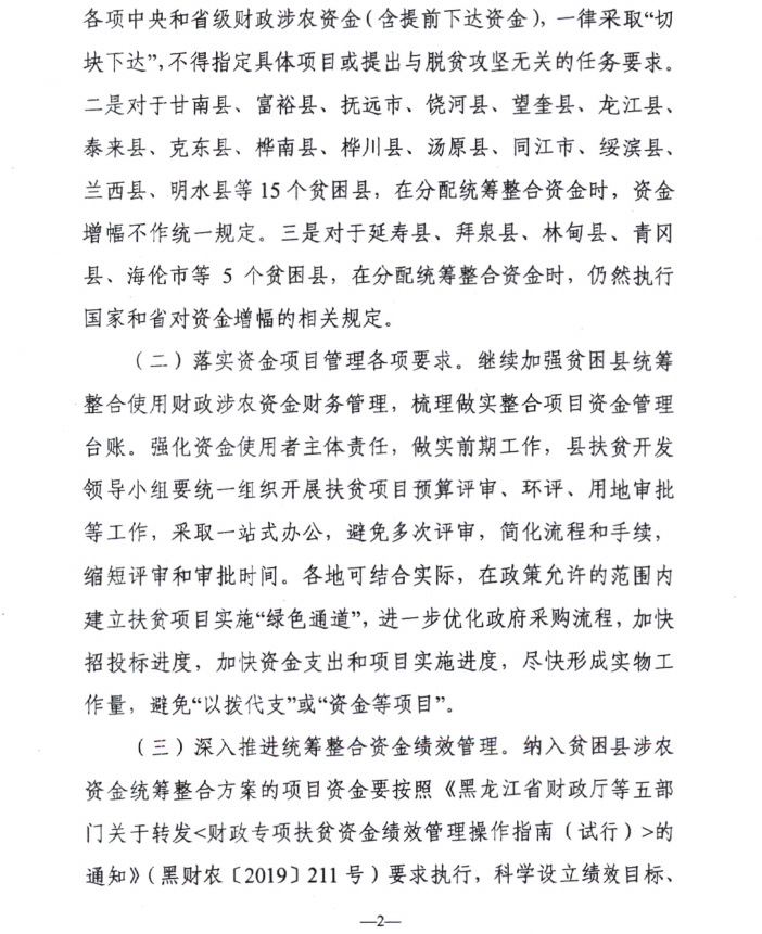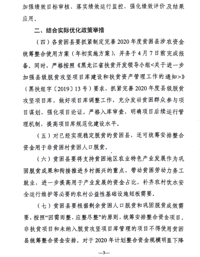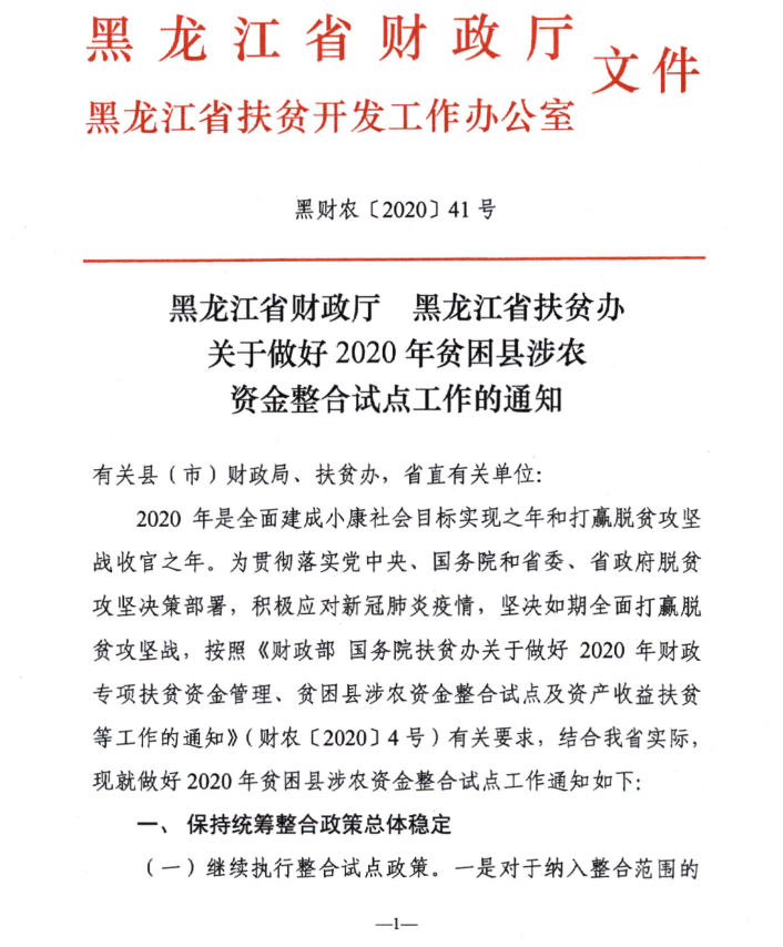 黑龙江省财政厅 黑龙江省扶贫办关于做好2020年贫困县涉农资金整合试点工作的通知 黑财农〔2020〕41号