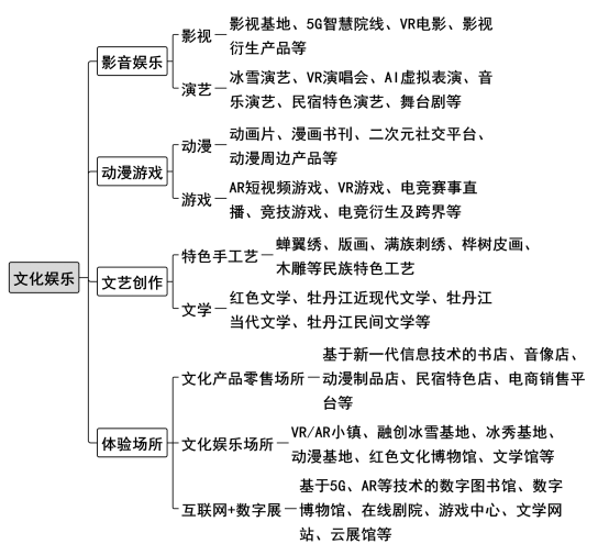 7.打造文化娱乐产业新高地。依托历史文化、民俗民族文化、山林文化、异域风情、红色文化等资源,加速推动新兴技术与文化娱乐产业渗透、融合,不断扩大优质文化产品供给,打造牡丹江文化品牌,提升文化影响力和创造力。推动红色文化体验区建设。牢牢把握传承红色基因的时代要求,整合全市红色文化资源,讲好中共六大、红色抗联、林海雪原剿匪、林口抗联秘密营地、八女投江等红色故事,推动红色文化与旅游、演艺、文创融合发展,谋划教育基地、影视基地、军事体验等红色文化体验基地,让东北抗联精神代代传承、历久弥新,活化成可听可看、可读可感的精神文化产品。推动中共六大历史资料馆、红花岭抗联小镇、孤榆树抗联密营地、七里地生态民俗村、马骏烈士纪念馆、张闻天工作室、八女投江烈士纪念馆、八女投江烈士殉难地纪念馆、杨子荣烈士纪念馆等红色旅游景区提档升级,推进东宁要塞旅游基础设施项目建设。推动传统文化体验基地建设。深度挖掘渤海国历史、镜泊湖红罗女、中东铁路、俄罗斯老街、老林区生活、中俄边境贸易、宁古塔、朝满民族等牡丹江传统文化底蕴,打造渤海国唐代历史文化、海林穆棱老林区伐木生活、横道河子中东铁路和俄罗斯文化等示范区,建设集娱乐、休闲、采摘、美食于一体的民俗风情体验基地。推动渤海国上京龙泉府遗址公园和博物馆、横道河子中俄文化艺术街区、上官地民宿、小朱家民宿、中兴村民宿等传统文化体验项目提档升级,推进唐长城国家文化公园、博物馆和林海雪原风景区项目建设。推动文化产业数字化转型升级。运用数字技术开发转化文化文物资源,做强牡丹江华创文化创意产业园,打造网络文学、有声书、视频直播等产业功能区和集聚区。探索建设渤海靺鞨绣、林口蚕翼绣、宁安满绣等文化产业数字化民俗馆。建设新型影视基地。以威虎山影视城为依托,以旅游观光为抓手,以推动文化传承为目的,以复原东北文化为辅助,打造影视制作、文艺演出、影视旅游、影视娱乐等互补发展的新型东北影视基地。2025年,文化产业发展活力和质量效益迈上新台阶,2026年现代文化产业体系初步建立。〔牵头部门:市文旅局,责任部门:市委宣传部,各县(市)区政府〕
