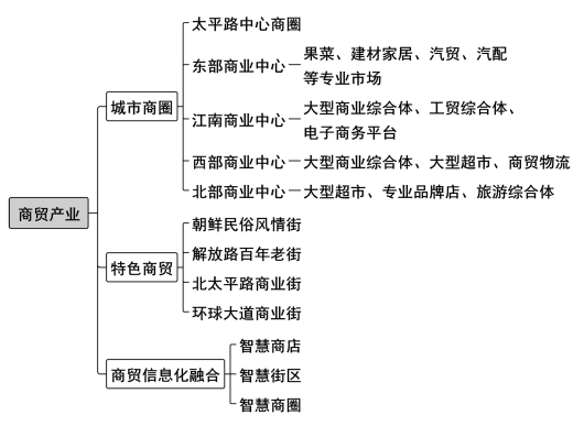 8.推动商贸业提档升级。依托商贸发展基础和对俄优势,促进线上线下融合,推动商贸产业向信息化、立体化、多层面、全方位方向发展,重点建设集购物、休闲、旅游为一体的商贸综合体,打造东北亚经济圈核心和黑龙江省东南部商贸中心。到2026年,社会消费品零售总额年均增长6%。优化城市商圈布局。改造提升太平路中心商圈,着力建设“东南西北”四大商业中心,东部商业中心重点发展果菜、建材家居、汽贸、汽配等专业市场,江南商业中心重点发展大型商业综合体、工贸综合体、电子商务平台,西部商业中心重点发展大型商业综合体、大型超市、商贸物流,北部商业中心重点发展大型超市、专业品牌店、旅游综合体培育特色商贸模式。优化各类商业网点设施规划布局,提升发展朝鲜民俗风情街、解放路百年老街、北太平路商业街、环球大道商业街等特色商业街和专业商业街,健全社区商业中心,结合边境贸易、特色旅游、农产品贸易等建设一批现代商贸特色小镇。加快推动商品交易市场提档升级,逐步搬迁中心城区大型批发市场,推进果品、蔬菜、海鲜、服装、汽配、建材等重点批发市场整合提升,推动多层次、多业态、多功能的特色性商圈和城市中心商圈发展,构建布局合理、功能齐全的商品批发市场体系。强化商贸信息化融合。支持建设“智慧商店”“智慧街区”“智慧商圈”,增强消费便利性。大力发展电子商务,鼓励传统企业开辟线上销售服务。引进和培育现代商贸服务企业,着力振兴“老字号”商贸服务企业,积极引导有实力的商贸流通企业向农村延伸网络,优化农村商贸流通布局,提高农民生产生活便利程度。〔牵头部门:市商务局,责任部门:市工信局、市农业农村局、市市场监管局、市城管局,各县(市)区政府〕