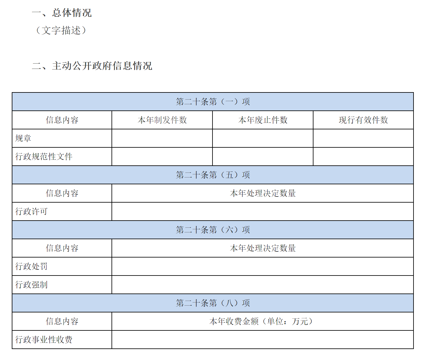 这一项主要报告《中华人民共和国政府信息公开条例》第二十条规定的法定主动公开内容中,适宜以数据方式呈现且具备统计汇总价值的内容,包括(一)(五)(六)(八)共四项,其中,第(五)项的行政许可数量、第(六)项的行政处罚和行政强制数量,包括已公开和依法未公开的全部处理决定。各项数据核定时间点为报告年度的12月31日。