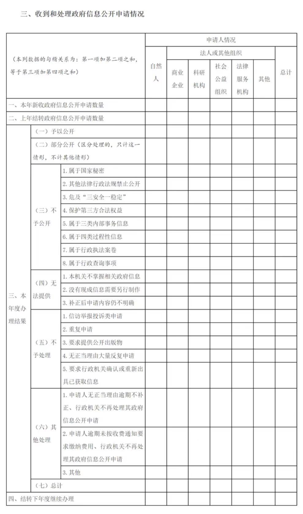 这一项主要报告两方面情况:一是申请人的类别;二是政府信息公开申请的最终处理结果。此项内容重在数据准确、要素齐备,全面客观反映政府信息公开申请接收和办理情况,便于政府信息公开工作主管部门全面掌握工作动态,使社会各界了解政府公开透明进程。